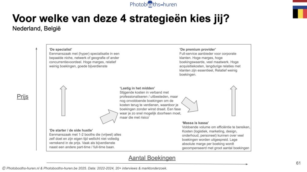De Nederlandse photoboothmarkt kent vier dominante strategische posities die verhuurders innemen, elk met specifieke kenmerken en risico’s. We onderscheiden in eerste instantie 2 assen: volume van boekingen en prijs, waarbij prijs een proxy is voor de mate van toegevoegde waarde, dat wil zeggen gespecialiseerde een productassortiment met een grotere maatwerk component. Een derde as is tevens voorstelbaar, namelijk geografie, waardoor twee verhuurders met dezelfde strategie op de eerste twee assen elkaar toch niet ‘bijten’.