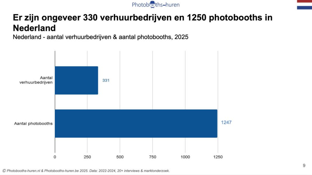 De totale Nederlandse photoboothmarkt voor losse verhuur wordt geschat op €15 miljoen, driemaal zo groot als de Belgische markt van €5 miljoen . Deze verhouding komt exact overeen met de relatieve bevolkingsomvang van beide landen.