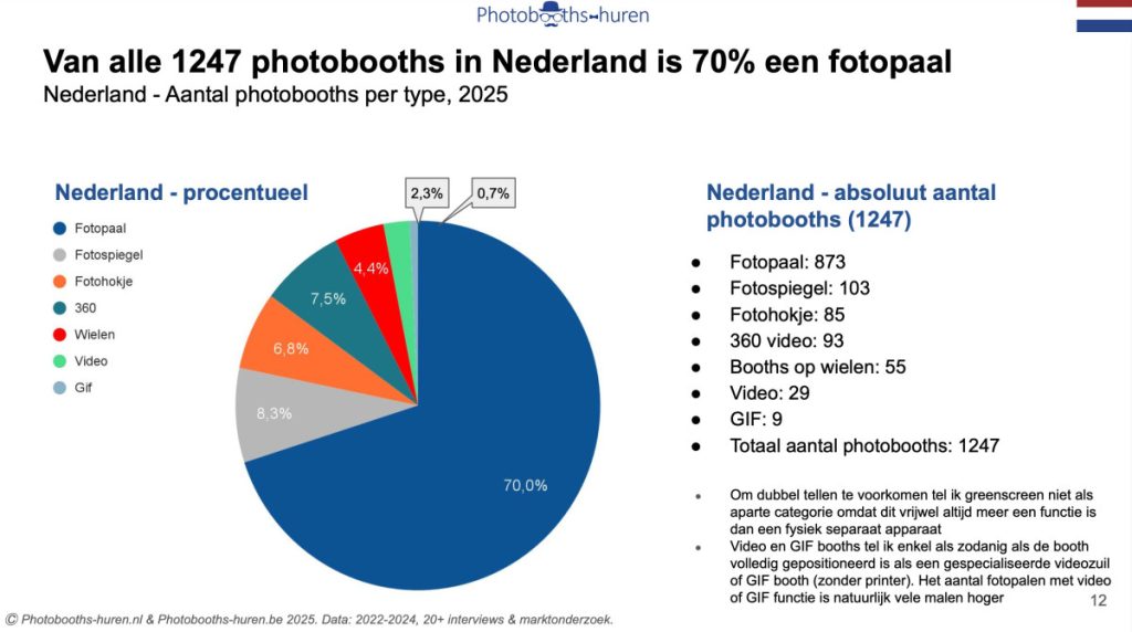 Het Nederlandse assortiment vertoont meer diversiteit dan de Belgische markt maar blijft sterk gefocust op fotopalen / fotozuilen. Ongeveer 70& van alle photobooths betreft het type fotopaal of fotozuil, aanzienlijk lager dan de 78% in België maar nog steeds dominant.